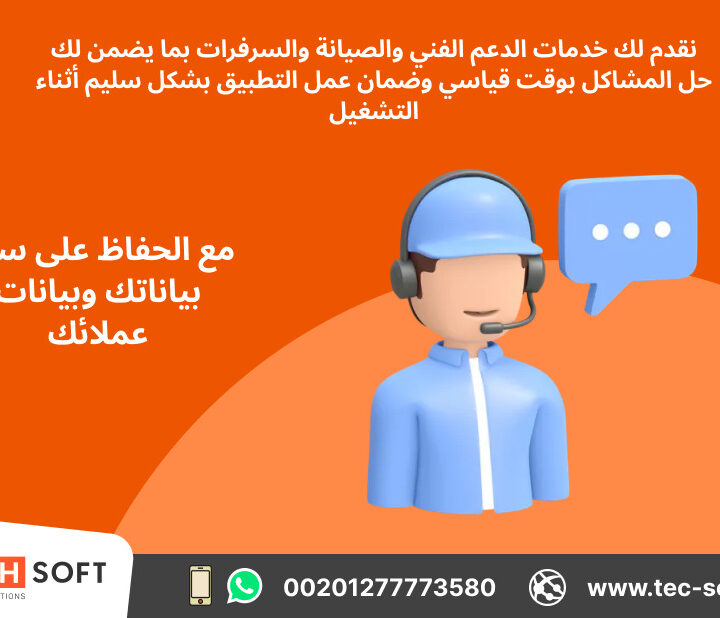 ·         نقدم لك خدمات الدعم الفني والصيانة والسرفرات بما يضمن لك حل المشاكل بوقت قياسي وضمان عمل التطبيق بشكل سليم أثناء التشغيل مع الحفاظ على سرية بياناتك وبيانات عملائك .