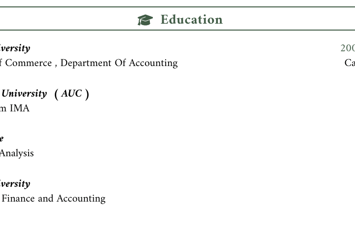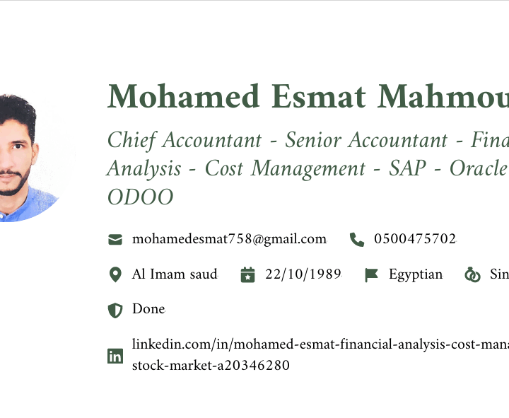 Accomplished Chief Accountant / Financial Manager with over 14 years of full-time experience in accounting, financial reporting, budgeting, and cost control. Holds a Bachelor’s Degree in Commerce (Cairo University), CMA (AUC), a Financial Analysis Diploma (Cambridge–Cairo University), and a Master’s Diploma in Accounting (Cairo University).