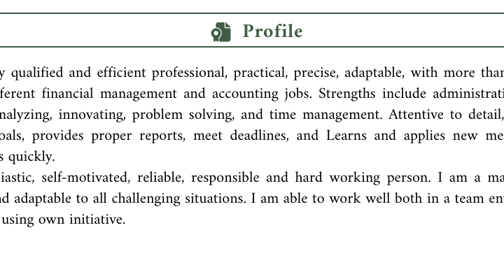 يتميز بالقدرة على الإدارة والتنظيم والعمل تحت الضغط، مع الحرص على تحقيق أعلى مستويات الدقة والكفاءة المالية.